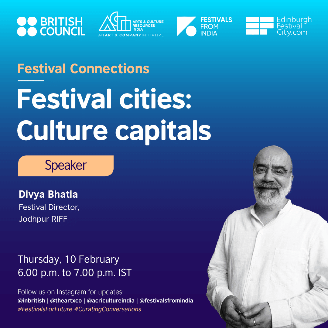 Panelists included Divya Bhatia (Festival Director, Jodhpur RIFF), Sunniva Ramsay (Programme Manager, International & Creative Sector Connections, Festivals Edinburgh), and Vidhya Mohankumar (Founder and Principal, Urban Design Collective). The discussion was moderated by Shwetal Patel (Independent Curator, Writer and Researcher).