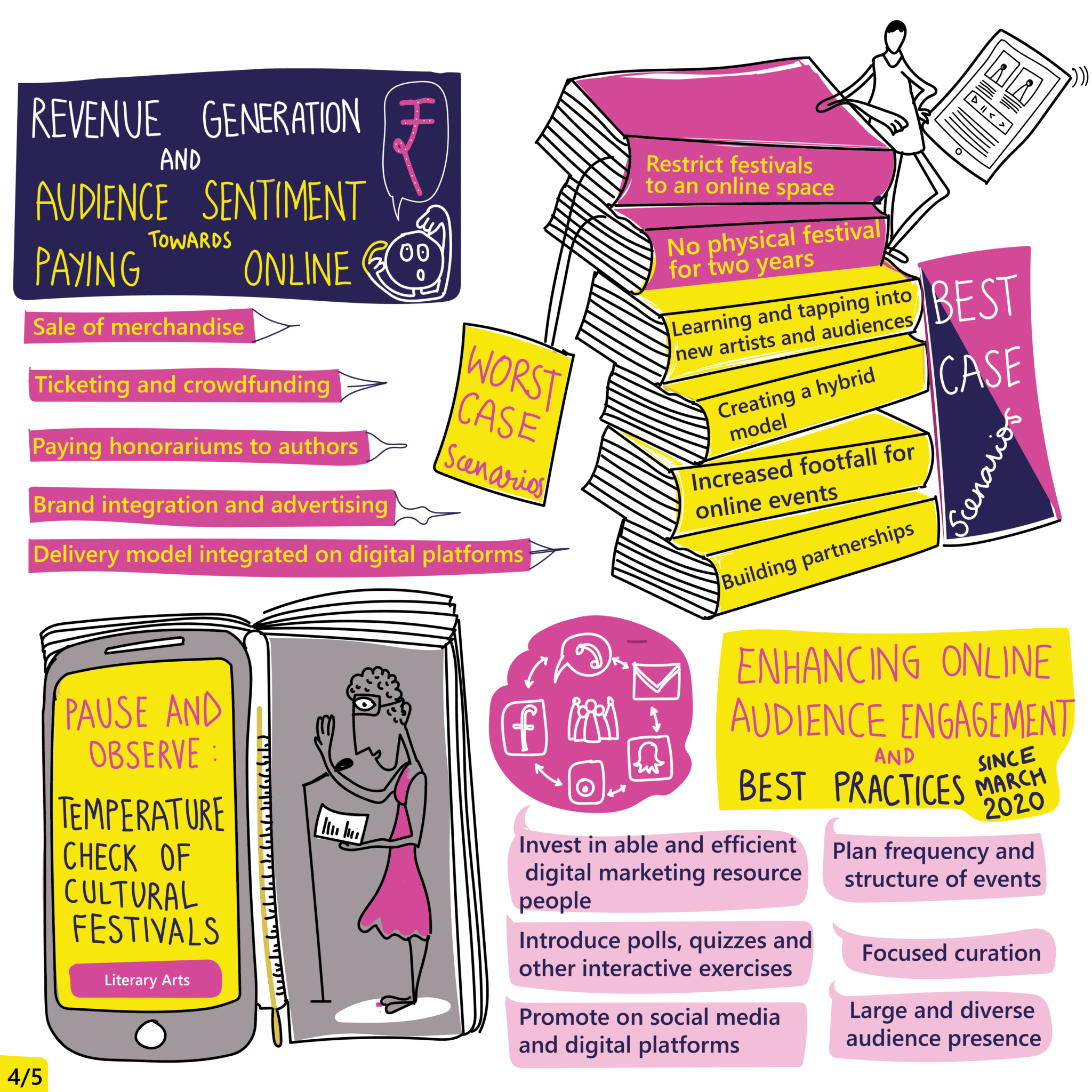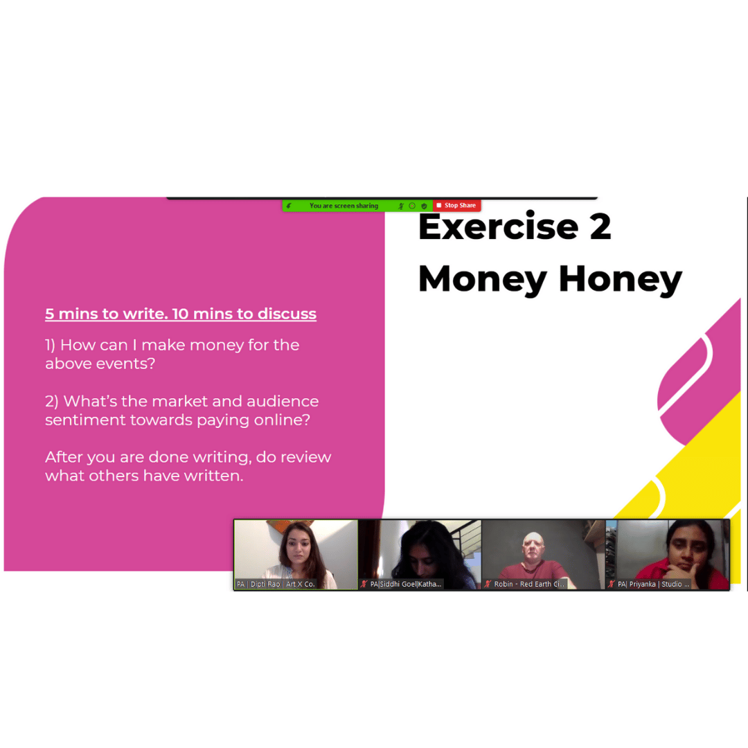 At the eighth Festival Connections session, the floor was opened to discuss festivals in a safe space with peers and other experts from the sector. The session was opened by Rashmi Dhanwani, the moderator for the evening, by presenting some insights from the sector study conducted by the Festival Connections team. It gave the audience a peek into the current planning cycles of their fellow festival organisers, the models they are pursuing, and other critical reference points. Further to this, the participants were divided into three groups based on the genre of their festivals, namely, Visual Arts, Performance Arts, and Literature. The session was designed to encourage a peer sharing and co-solving approach through three exercises of 15 minutes each. After the breakout session, the participants from the various groups were back for an open Q&A discussion.